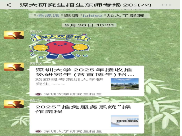 研究生招生的详细信息,并且为大家提供一个便捷的交流与咨询渠道,我们特别创建了“深大研究生招生东师专场”微信群。