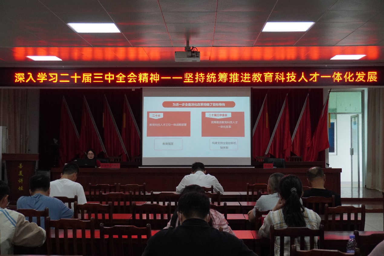 在汕尾市城区马宫街道新时代文明实践所,赵蕾蕾助理教授作了题为《深入学习党的二十届三中全会精神——坚持统筹推进教育科技人才一体化发展》的理论宣讲。内容主要由三个部分组成:第一,介绍了社会主义建设中教育科技人才一体化发展的提出过程。第二,梳理了教育科技人才一体化发展的历史脉络。第三,阐释了党的二十届三中全会对科技教育人才一体化发展的各项发展要求,并结合党的十八届三中全会以来的实践成果,讨论了教育科技人才一体化融合发展的重点方向。