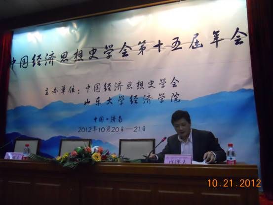 2012年10月20-21日,由中国经济思想史学会主办,山东大学经济学院承办的中国经济思想史学会第十五届年会在山东大学举行。来自中国社会科学院、北京大学、清华大学、北京师范大学、复旦大学、武汉大学、山东大学、上海财经大学等高校、科研院所的100余名专家学者出席了本次年会。我校经济学院邹进文教授、瞿商教授、朱华雄副教授、宋丽智副教授向大会提交论文并应邀参加了本次年会。与会代表围绕“中国经济思想的变迁与齐鲁文化的本土化、国际化研究”这一主题进行深入研讨,取得了丰硕的成果。中国经济思想史学会会长、武汉大学商学院严清华教授做了工作报告,并对中南财经政法大学经济学院经济思想史专业在2012年度获得一项中国社科基金项目(邹进文教授)、两项教育部人文社科基金项目(朱华雄教授、宋丽智副教授)进行了高度的赞扬和祝贺。