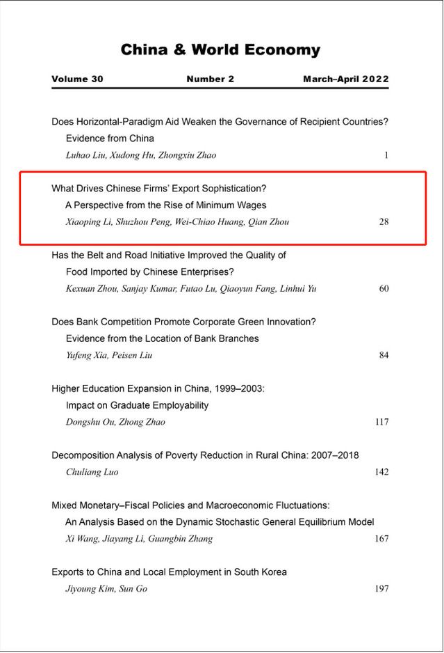 2022年3月,我院教师李小平教授合作论文《What Drives Chinese Firms’ Export Sophistication? A Perspective from the Rise of Minimum Wages》在期刊《China & World Economy》上正式刊出。