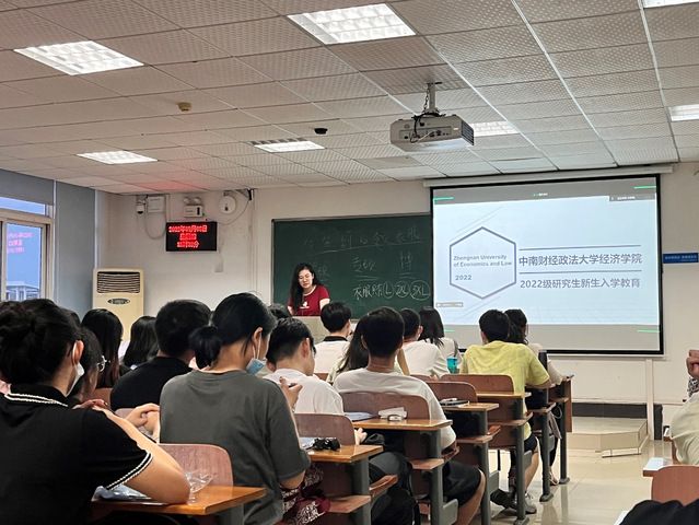 (通讯员:周铮 摄影:熊瑾瑜)“新学期、新同学、新气象!”为帮助2022级研究生新生尽快转换角色、融入新环境、增强归属感,中南财经政法大学经济学院于9月5日晚举办了2022级研究生新生教育大会。出席会议的有经济学院硕士研究生辅导员岳明泽,博士研究生辅导员雷菁,研究生会执行主席刘静瑶、杨斯、朱雅婕,一本道主任熊瑾瑜、副主任周铮,艺术团团长张晓磊,2021届研会主席团成员罗厾尧、陈江宇,2022级全体硕博研究生新生(受疫情影响,部分同学线上参与),本次会议由雷菁老师主持进行。