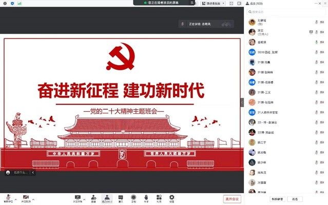 (通讯员 唐岩)为深入学习宣传贯彻党的二十大精神,引导同学们将思想和行动统一到党的二十大精神上来,11月29日上午,经济学院以线上形式组织开展了全体博士、2020级硕士二十大精神学习贯彻主题班会。此次班会由2020级硕士研究生涂芸主持,研究生工作办公室主任岳明泽老师、研究生辅导员雷菁老师、省教育厅博士生宣讲团成员张钰林同学、全体博士研究生以及2020级全体硕士研究生参会,参会人数共计120余人。