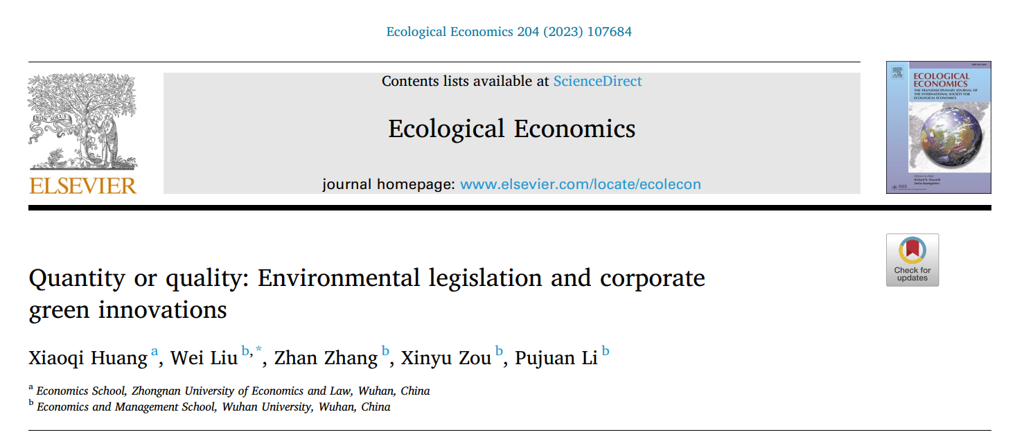 2023年2月,我院教师黄晓琪博士为第一作者的合作论文《Quantity or quality: Environmental legislation and corporate green innovations》在期刊《Ecological Economics》第204卷正式刊出。