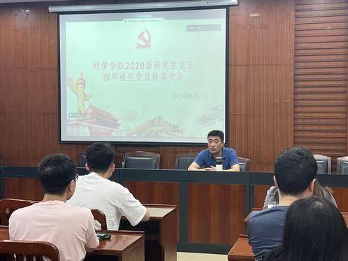 (通讯员:李雨阳)为深入开展学习贯彻习近平新时代中国特色社会主义思想主题教育,引导和激励广大毕业生党员坚定理想信念,充分发挥毕业生党员先锋模范带头作用,走好在校“最后一公里”,以饱满的热情迎接新的学习和工作岗位,2023年6月9日下午,经济学院开展2023届研究生毕业生党员教育。经济学院党委书记刘刚、经济学院研究生辅导员岳明泽、雷菁出席此次活动,本次活动采取线上线下相结合方式进行,由2021级研究生党支部书记罗厾尧主持。