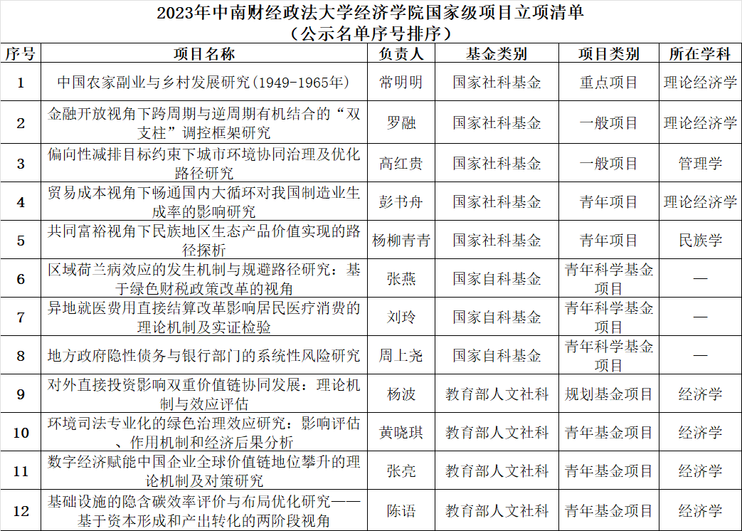 在学院领导高度重视和精心组织下,我院教师申报国家级项目热情高涨。全院申报国家社会科学基金项目19项,立项5项,其中重点项目1项,一般项目2项,青年项目2项,综合立项率26.32%;获批国家自然科学基金项目3项,均为青年基金项目;获批教育部人文社科项目4项,其中规划基金项目1项,青年基金项目3项。今年我院国家级基金获批“战绩”反映出了教师们对经济学科研工作的饱满热情以及学院科研服务工作的突出成效。