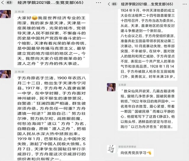 王雨濛同志分享道:我的家乡是天津,给大家分享愿做革命的“渡人之舟”于方舟同志的伟大事迹。八七会议之后,于方舟受组织委派,准备奔赴玉田县带领农民发动第二次暴动。10月底暴动失败,他率部突围,不幸被俘。在狱中,面对敌人的酷刑和死亡威胁,于方舟坚贞不屈,表现出一个共产党人的革命气节和崇高品质。