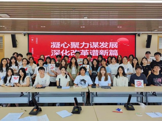 (通讯员 吴仕涵 摄影 田鹏程)联学联建强党性,同心同向促发展。为深入贯彻党的二十届三中全会精神,精准把握会议核心要义,激励并引导广大学生党员同志积极担当、勇于创新,9月19日下午,中南财经政法大学经济学院与工商管理学院于文瀚楼东718室联合开展了主题为“凝心聚力谋发展 深化改革谱新篇”的九月联学联建主题党日活动。本次活动由工商管理学院本科2022级党支部陆宇涵同学主持,工商管理学院本科2022级党支部全体党员与经济学院本科生第一、第二、第三党支部2022级党员参加此次活动。
