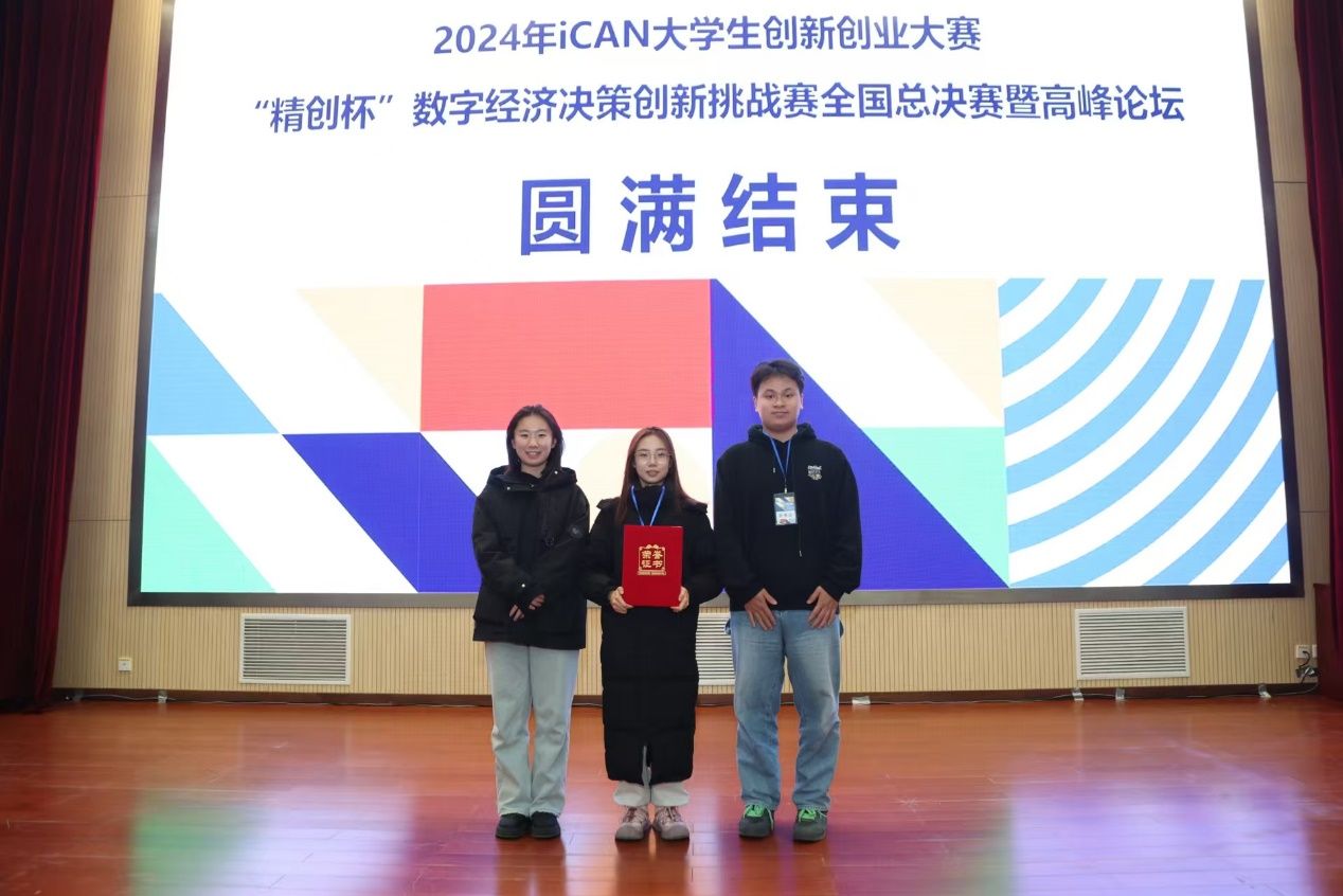 2024年12月6日至8日,2024年iCAN大学生创新创业大赛“精创杯”数字经济决策创新挑战赛(简称“iCAN大赛”)全国总决赛在天津师范大学举行。我院数字经济系周强副教授作为指导老师组建的“数字巨梦队”一路从区域赛披荆斩棘,成功入围全国总决赛,先后获得了2024年iCAN大学生创新创业大赛(第三区域赛)一等奖,以及全国总决赛三等奖。这是我院实施“以生为本”融通创新教学改革以来,首届数字经济本科生团队参加数字经济领域的国家级比赛。