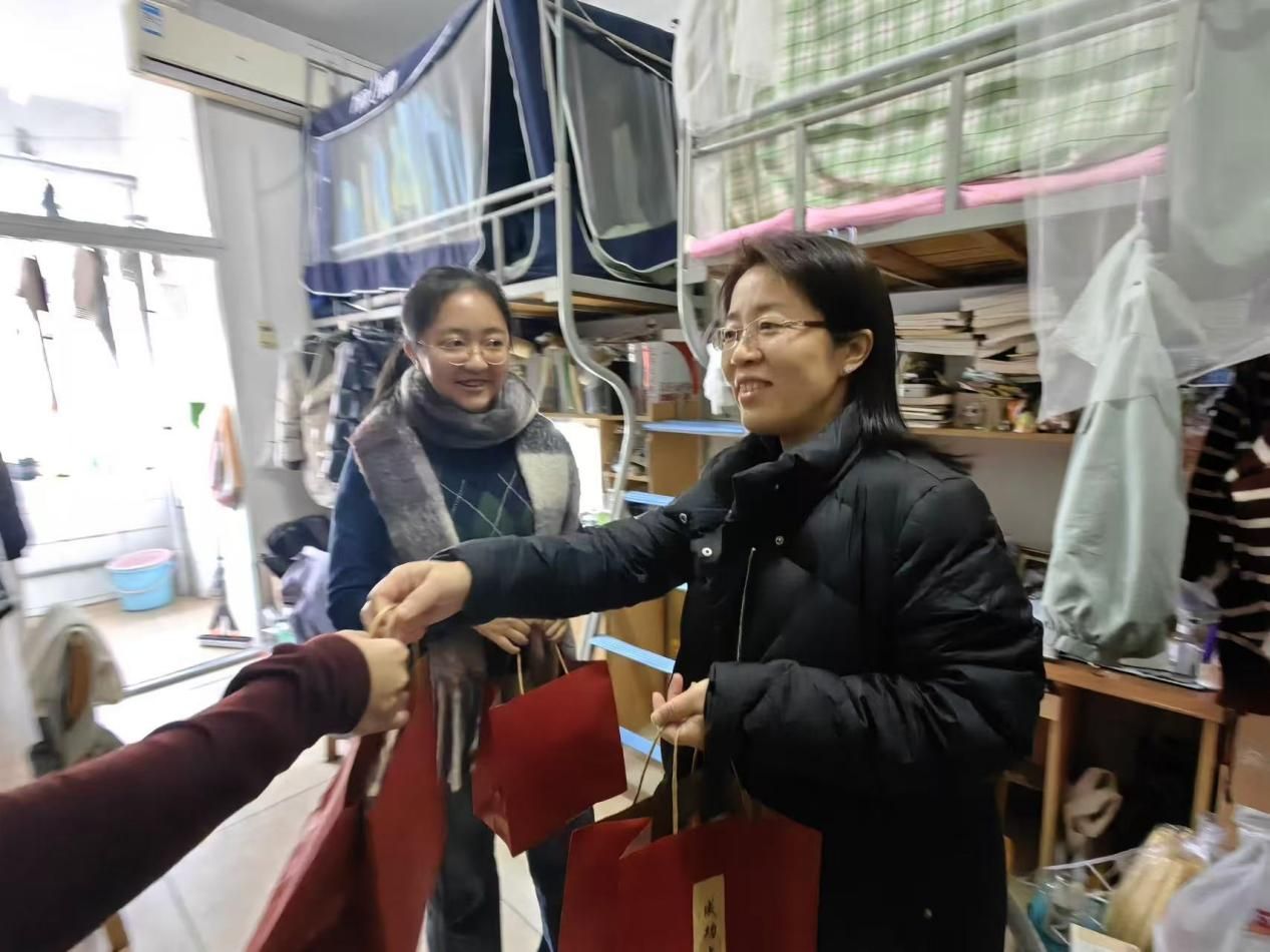 (学生记者 刘路洋 摄影 刘路洋)“书卷多情似故人,晨昏忧乐每相亲。”在这个呵气成霜的冬日,考研的战鼓即将敲响。为了给考研学子们加油鼓劲,经济学院精心筹备了一场暖心关怀活动,为他们送去温暖与力量,用实际行动为他们的逐梦之旅保驾护航。12月18日,经济学院院长石智雷、副院长宋丽智及学生工作办公室的老师们走访2021级学生宿舍,将学院精心准备的备考礼包送到同学们手中。
