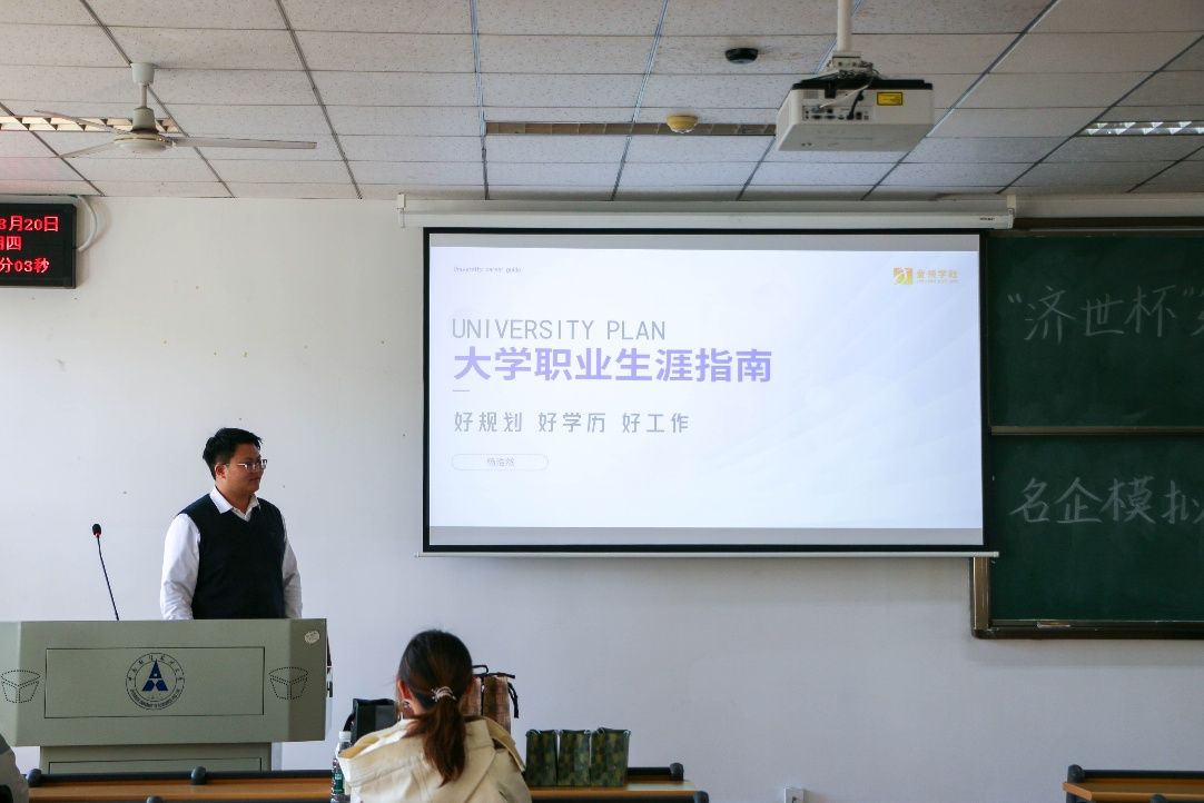 活动伊始,主持人详细介绍了招聘大赛的背景和意义,并宣布宣讲会正式开始。随后,杨浩然对就业方向、行业选择、简历制作技巧以及大学四年的规划进行了深入分享。他结合自身经历,探讨了大学生活中的迷茫与焦虑,并提供了如何选择和发展个人职业道路的实用建议。