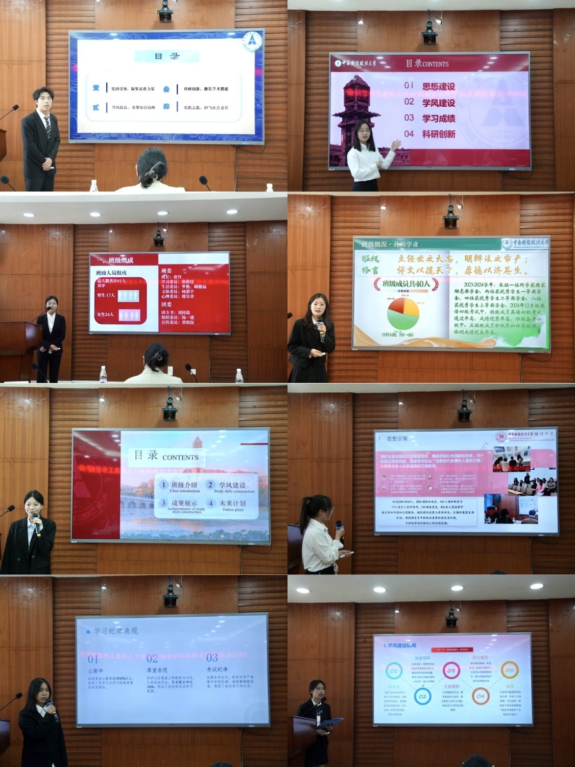 在“优良学风班级”答辩环节。经济2302班围绕党团引领、学风建设、科研创新与实践志愿四个维度,系统阐述班级关于学风建设的具体举措。数经2301班从思想引领、学风建设、学业成绩、科研实践四个层面,展现班级"一对一"学业帮扶、学习经验分享会等特色制度。经济2402班和国商2301班均通过班级基本情况、学风建设活动、学业成绩数据等内容,全面呈现班级建设成果,并提出未来发展规划。经实2201班以思想引领筑牢根基,通过党团联动激发全员向学动力,强化课堂规范与课外实践融合,实现学业成绩、科研创新、文体发展全方位突破。经法2301班则向我们展现班级如何扎根学业,进行多元工作探索,以创新型制度护航学业发展。经统2301班以班级精神风貌为切入点,结合思想引领活动、学风建设举措等具体案例进行介绍。经统2401班通过背景分析、学业发展数据、学风建设成效三大板块,生动梳理班级学风建设的实践历程,并明确下一阶段发展目标。
