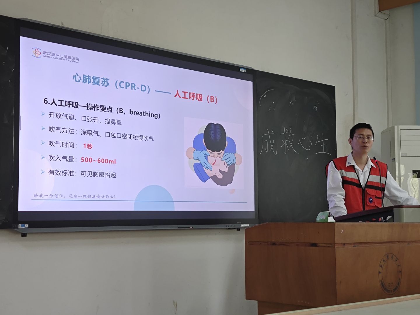 (通讯员:胡思宇)据统计,我国心源性猝死率高达41.8例/10万人,每年约54.4万人因此失去生命,相当于每一分钟就有一人倒在死神门前。而当意外发生时,黄金救援时间仅有4-6分钟,每延迟1分钟实施心肺复苏(CPR),患者生存率就会下降7%-10%。在救护车抵达前,掌握CPR技能的“第一反应人”,就是患者与死神博弈的关键力量。CPR不仅是专业医护人员的职责,更是每个人都应掌握的“救命必修课”。一次正确的CPR操作,都可能将濒危的生命从悬崖边拉回。为了普及心肺复苏的急救方法,提升学生安全应变能力,2025年4月19日上午9:30,中南财经政法大学经济学院志愿者协会(以下简称“经院志协”)与武汉亚洲心脏病医院在中南财经政法大学首义校区文泽楼301教室联合开展教学。活动已于11:30圆满结束。