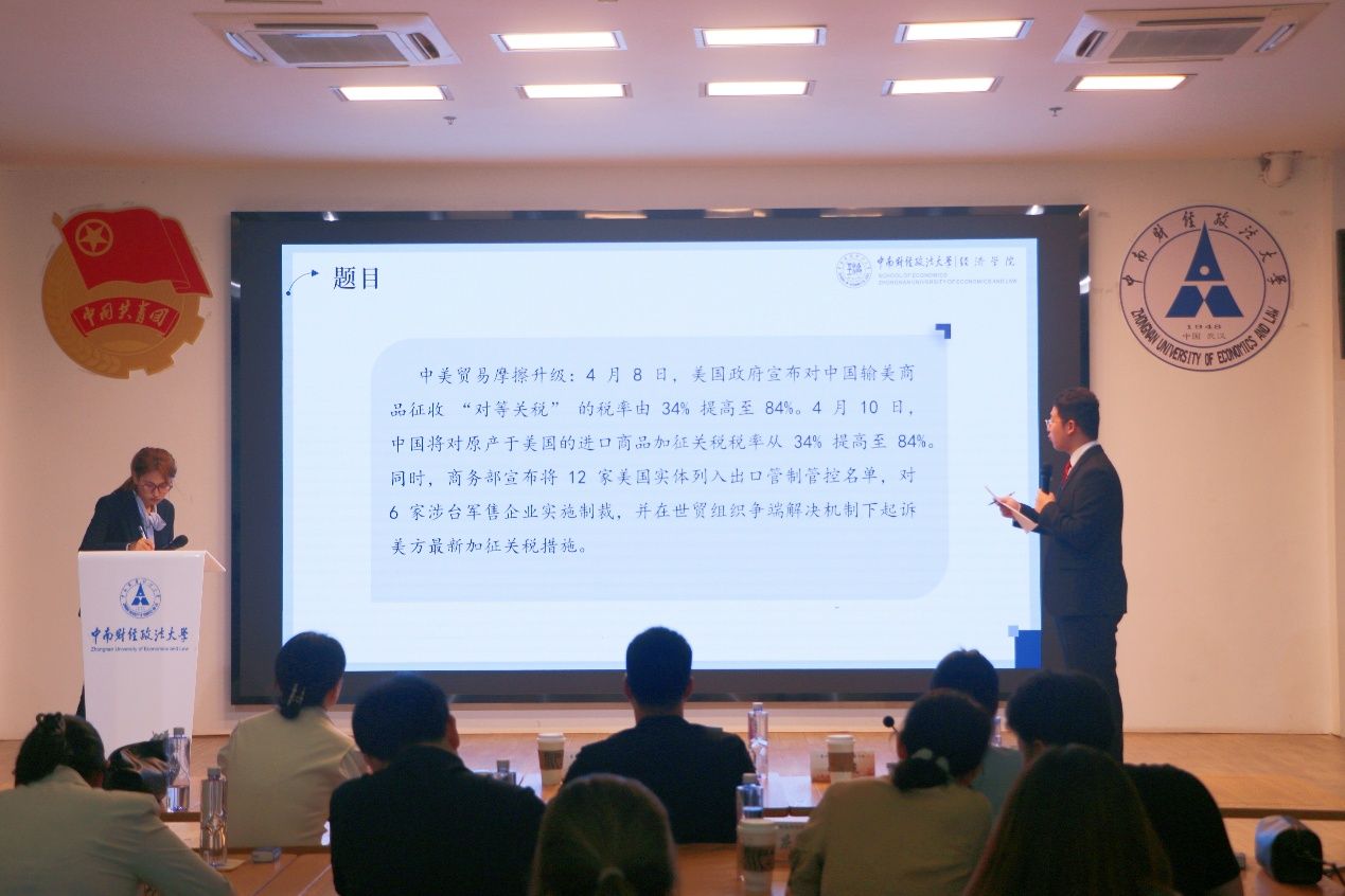 (学生记者 高舒翔 摄影 刘路洋)策九州经纬,览万古沧桑。为持续提升我校学子财经思维建构与实战应变能力,培养兼具专业底蕴与市场洞察力的复合型财经人才,经济学院第十一届财经评论员大赛决赛于5月24日14时在大学生素质教育中心举办。经济学院经济学系系主任谢靖、国际经济学系副系主任吴姗姗,团委副书记张燕担任评委。经济学院党委副书记俞凡、2024级本科生辅导员孟庆红、学生工作办公室主任周琼、团委书记陈远瞻出席本次决赛,经济学院本科生各班代表到场观看。