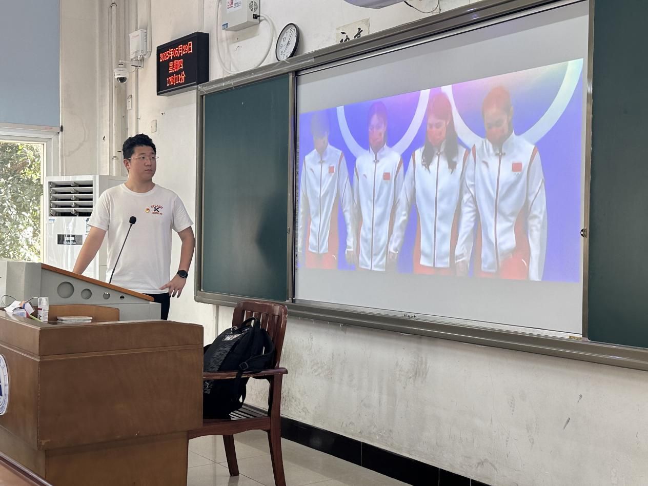 活动伊始,全班同学齐声唱响团歌,同学们的歌声坚定有力,展现出新时代青年积极向上的精神风貌,表达着对共青团的坚定信仰和对美好生活的追求。紧接着,高枫博对五四运动及五四精神进行了详细讲解,回顾了历史背景,并结合人民日报的青年寄语,为同学们深刻诠释了青年一代的历史使命。随后,全班同学观看了主题为“中国青年”的视频,视频生动展现了新时代中国青年的风采和奋斗目标,激发了同学们的集体荣誉感和责任感。高枫博还深入为同学们解读了习近平总书记对青年的亲切回信,回信中明确指出青年要坚定理想信念,勇担时代责任,努力成为有理想、有本领、有担当的时代新人。