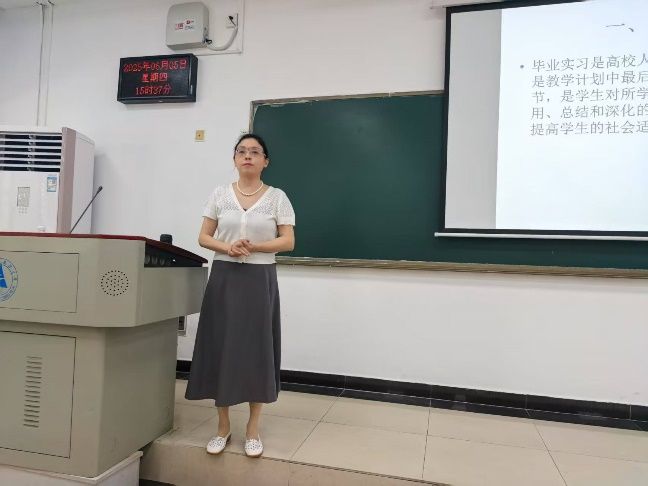 随后,杨艳红老师具体介绍了本次毕业实习工作的总体安排。她依次讲解了实习工作要求、实习报告撰写要求、实习成绩评分标准,还着重介绍了集中实习岗位的具体情况,并对毕业实习期间的纪律和态度进行了反复强调。