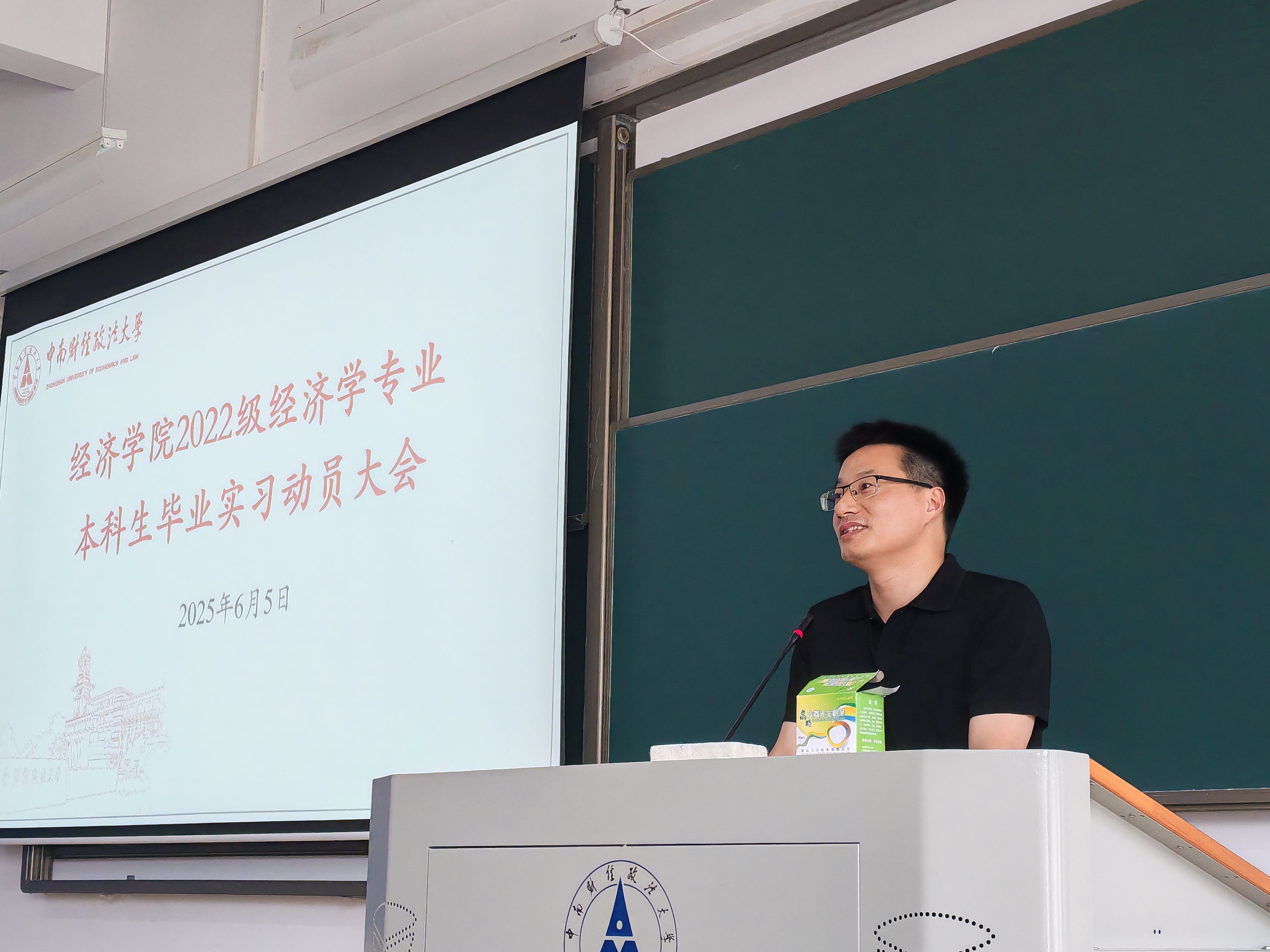 经济学系实习动员大会由系主任谢靖主持。谢靖老师首先向各位同学强调了毕业实习的意义,具体包括促进理论与实践的融合共进,提升综合素质,促进高质量就业以及实现个人价值与社会价值的统一等。