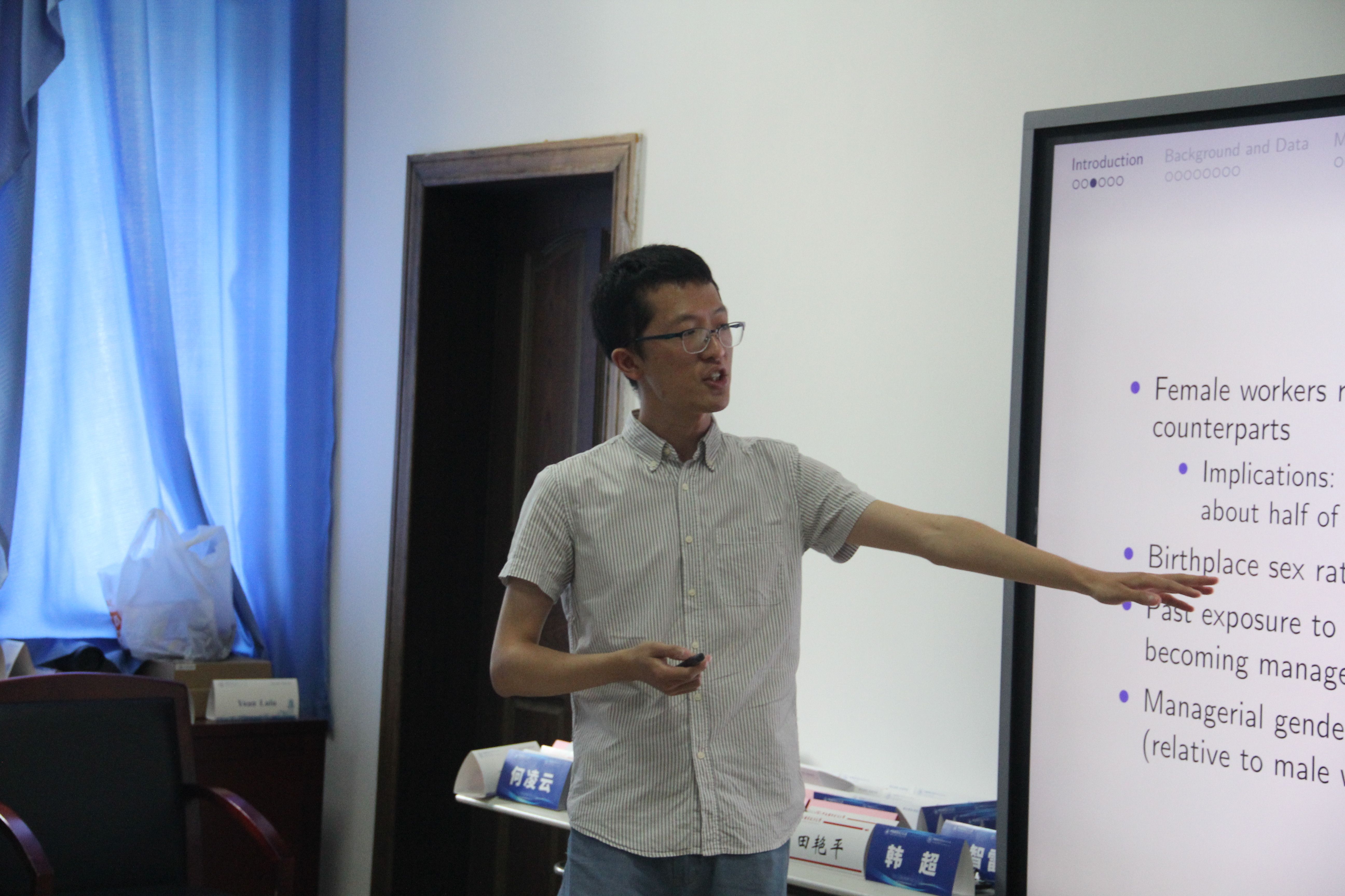 最后,中南财经政法大学万千副教授分享了题为《检验婚姻转移支付理论:基于中国贸易自由化的经验研究》的报告。万千副教授基于彩礼和嫁妆在中国普遍存在的现实情况,基于三大主流婚姻转移支付理论检验了贸易自由化与婚姻嫁妆的因果关系,从偏向男性与偏向女性的贸易自由等多重视角分析了对婚姻市场的影响。本研究为中国社会家庭关系与婚姻市场提供了有趣且重要的理论基础。在交流环节,与会师生针对关税贸易壁垒、贸易自由化冲击时间、样本数据年限、彩礼归属问题的异质性、经济学与社会学的互补结合等问题展开了深入讨论。