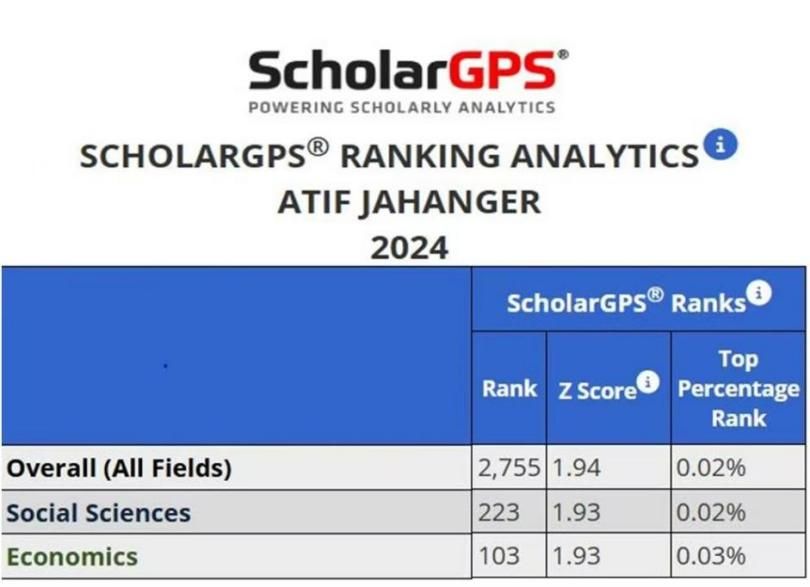 近日,国际学术分析平台ScholarGPS发布了2024年度高排名学者全球前0.05%顶尖学者榜单(Highly Ranked Scholars™)。中南财经政法大学经济学院世界经济专业2021届毕业生Atif Jahanger(巴基斯坦籍)(导师:杨波教授)入选此次榜单,并于近五年榜单(Highly Ranked Scholar - Prior Five Years)中位列“全学科领域”前0.02%(Ranked 2,755th in All Fields)、“社会科学领域”前0.02%(Ranked 223rd in Social Sciences Field)及“经济学领域”前0.03%(Ranked 103rd in Economics Field)。