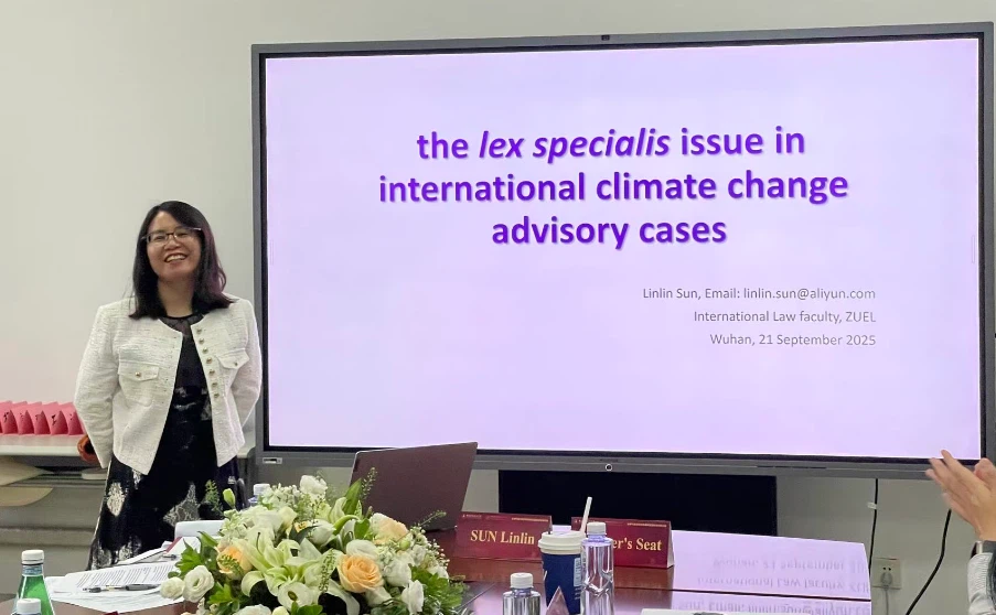 孙林林讲师以“The ‘Lex Specialis’ Issue in Climate Change Advisory Cases”为主题,主要探讨了国际气候变化法律中的特别法(lex specialis)问题,通过分析国际法庭的最新咨询意见,深入研究了国际气候法与其他国际法规则之间的关系。与谈人Faure教授就国际气候法以及其他国际法之间,何时以及如何管理和统一标准(尤其是政府层面的标准)与孙林林讲师展开了讨论。