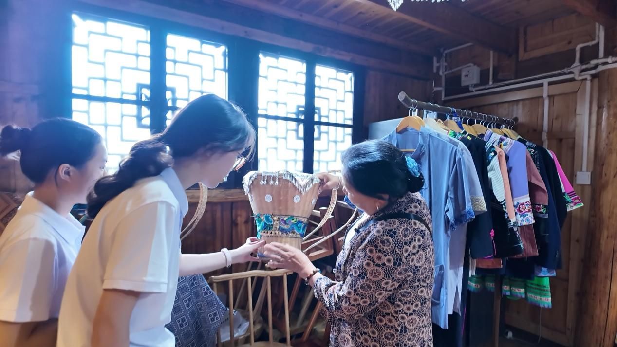 7月3日,实践队先后走访了十八洞村梨子寨苗绣基地和马鞍村苗绣工坊,进行古色资源苗绣文化的调研工作。在苗绣基地,成员们拜访了前村支书、现苗绣组织人石大姐,她向成员们详细介绍了苗绣悠久的历史背景、当前的传承现状、创新工艺和销售渠道。苗绣工坊里,团队成员通过与负责人以及绣娘们的深入交流,对十八洞村苗绣的非遗传承情况与产业发展规模,有了更为深入的认识。