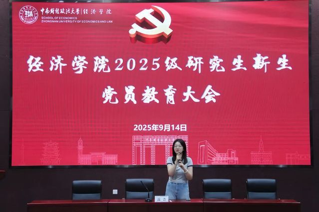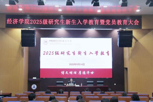 为助力经济学院2025级研究生新生顺利开启学术新程,同时强化新生党员党性修养,经济学院于9月14日14:30在文翰楼北报告厅举办研究生新生入学教育暨党员教育大会,2025级硕士研究生辅导员岳明泽、2025级博士研究生辅导员雷菁、经济学院全体2025级研究生新生参与本次大会。