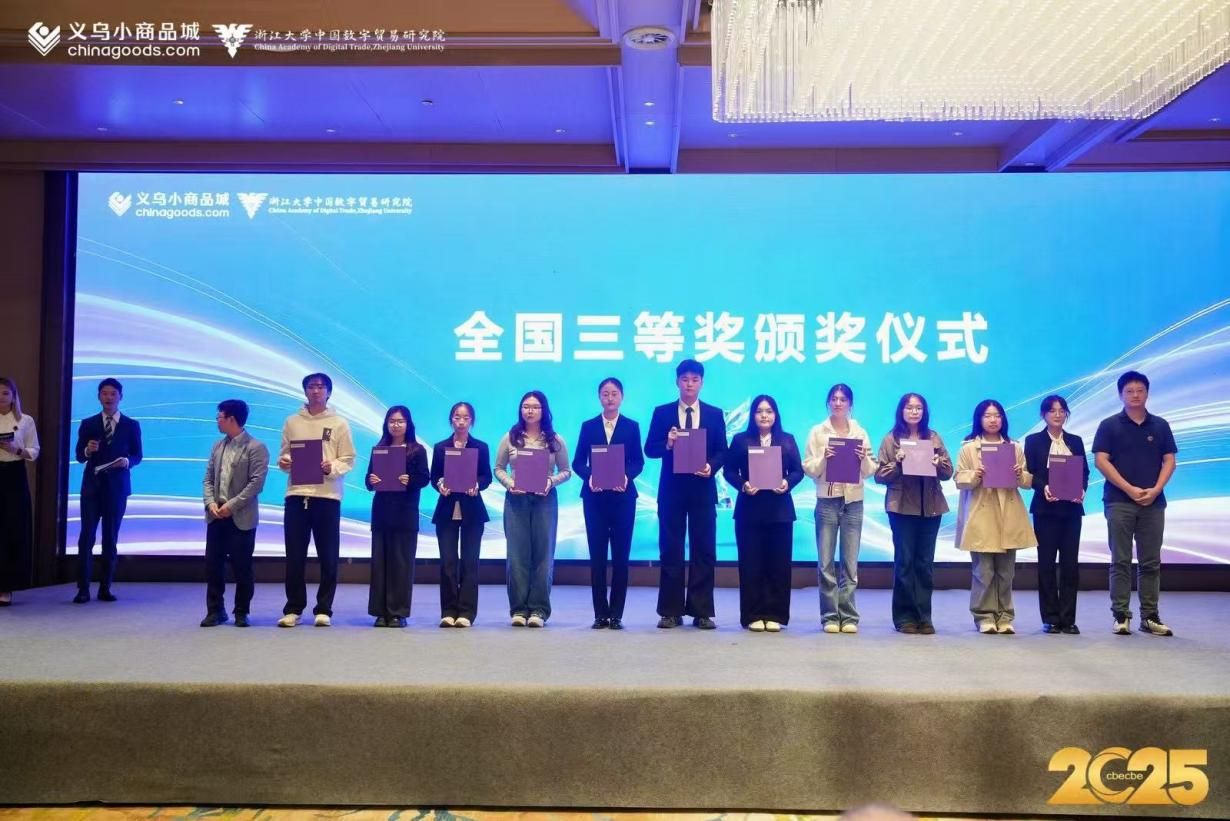 2025年9月27日至28日、10月23日至24日,第四届全国大学生数字贸易综合技能大赛迎来了全国总决赛。本次大赛共设4个竞赛模块,分别是1688大学生AI创业赛、义乌小商品城AI +创新创业赛、尼奥尼跨境直播赛和丝路电商来华留学生案例赛,分别在浙江大学紫金港校区、中国计量大学和义乌小商品城等地展开。该项赛事自创办以来,已经走过了四年的历程,赛事影响力持续扩大,已然成为极具影响力的全国性品牌赛事,累计吸引1213所高校、6万余名师生参与。自赛事启动以来,共吸引全国309所高校、2279支团队踊跃参与,最终276支优秀团队晋级全国总决赛。中南财经政法大学经济学院杨波教授、潘安教授,以及张亮、张群、舒中桥、黄晓琪等多位老师全程指导参赛团队。最终我院团队取得了优异成绩,斩获了二等奖1项和三等奖3项。杨波教授、舒中桥老师荣获优秀指导教师奖。