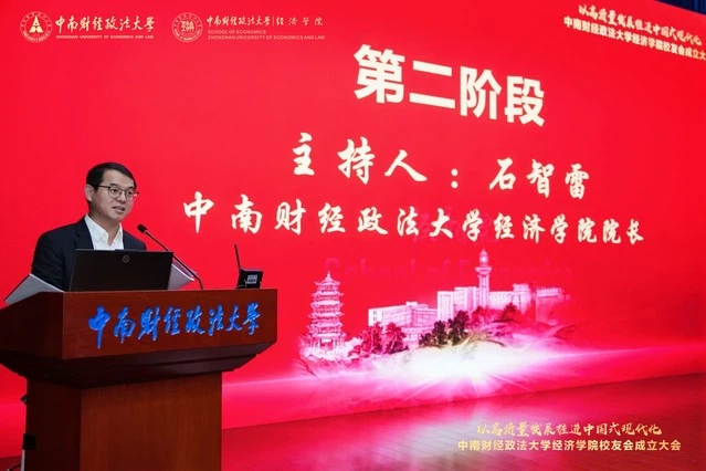 成立大会落幕之后,进入第二阶段——“以高质量发展推进中国式现代化研讨会”,由经济学院院长石智雷主持。本环节特邀三位深耕经济学领域、成果卓著的学者作主旨发言,围绕“经济学院的学术地位与中国经济治理知识体系的构建”、“经济学自主知识体系构建”和“数字经济的演进逻辑”关键议题分享洞见,为现场师生与校友带来思想启迪。