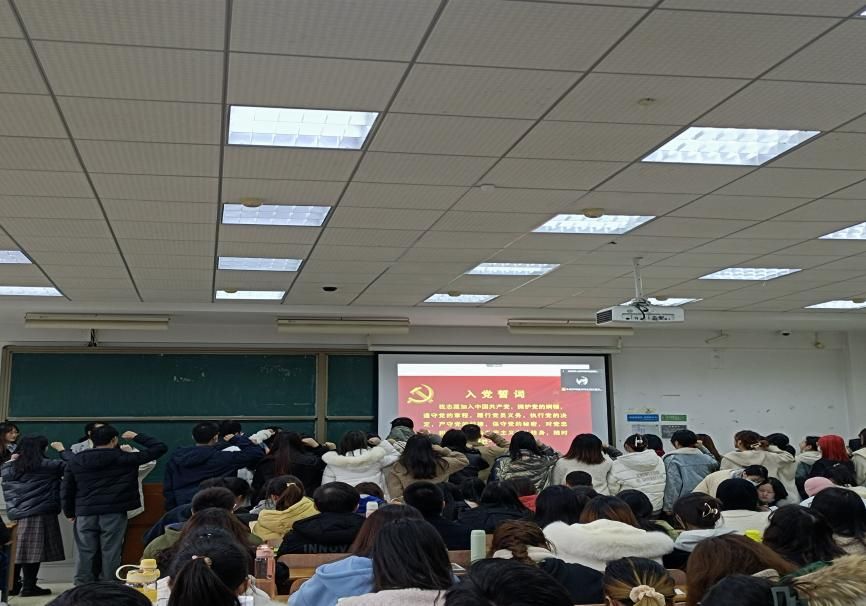 会议开始,由老师组织34名预备党员宣读入党誓词。宣誓完毕之后,孟庆红老师了介绍本次会议的主题——讨论接收宁园等25名同志为预备党员,宁园等25同志依次围绕个人在思想、学习和生活等方面的情况在大会上做了详细的汇报。