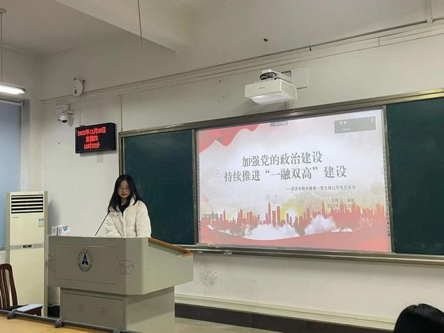 (通讯员:柴紫微)为巩固深化主题教育成果,贯彻落实巡视整改要求,深入推进“一融双高”建设,11月30日下午于文添楼206,经济学院学硕第一党支部开展了主题为“加强党的政治建设,持续推进‘一融双高’建设”的主题党日活动,支部全体党员参与学习,活动由支部书记杨帆主持。