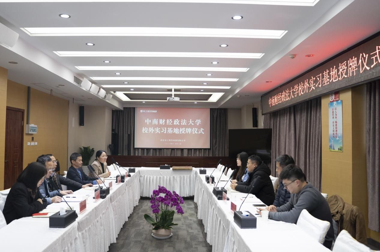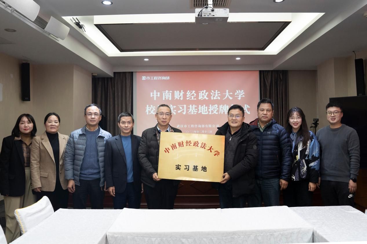 20231213日下午,中南财经政法大学经济学院与武汉市工程咨询部有限公司建立校外实习基地挂牌仪式在江岸区武咨大厦6楼会议室举行。出席挂牌仪式的有经济学院院长李小平、带队老师陈立兵、研究生办公室主任岳明泽、党政办公室主任张可,武汉市工程咨询部总经理杨泽新、纪委书记雷华、副总经理汪平、副总经理廖志平、事业七部总经理朱敏等。