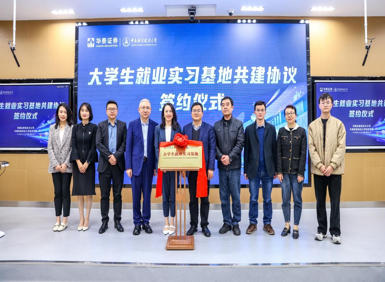 活动伊始,李小平院长和闵捷总经理分别代表中南财经政法大学经济学院和华泰证券湖北分公司共同签订大学生就业实习基地共建协议,双方代表一同上台为大学生就业实习基地揭牌。