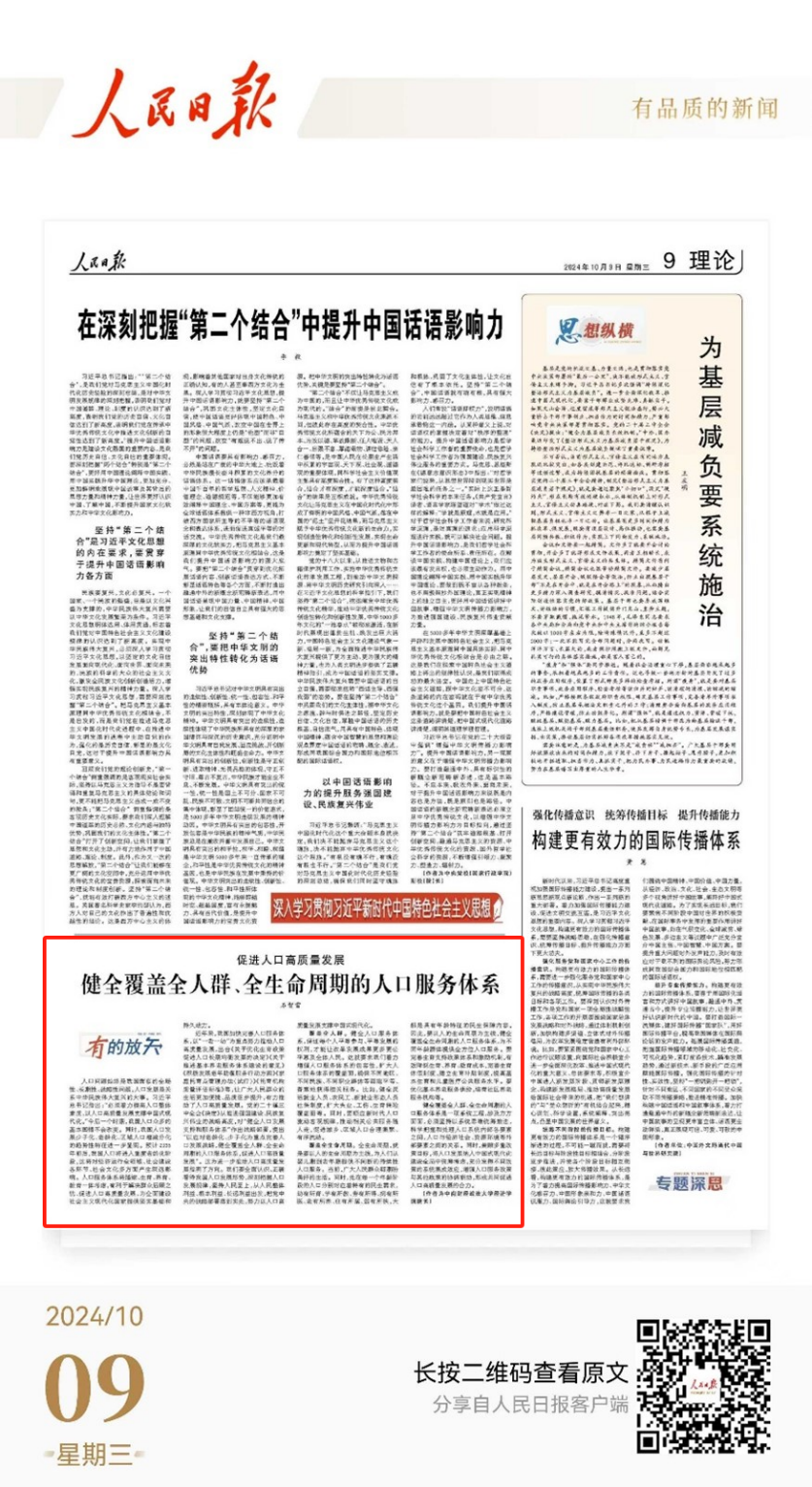 10月9日,我院院长石智雷教授在《人民日报》理论版发表文章《健全覆盖全人群、全生命周期的人口服务体系》。该文深刻阐释了党的二十届三中全会《决定》中关于“健全人口发展支持和服务体系”的重要论述。文章指出,健全人口服务体系,有利于解决群众后顾之忧、促进人口高质量发展,为全面建设社会主义现代化国家提供坚实基础和持久动力。