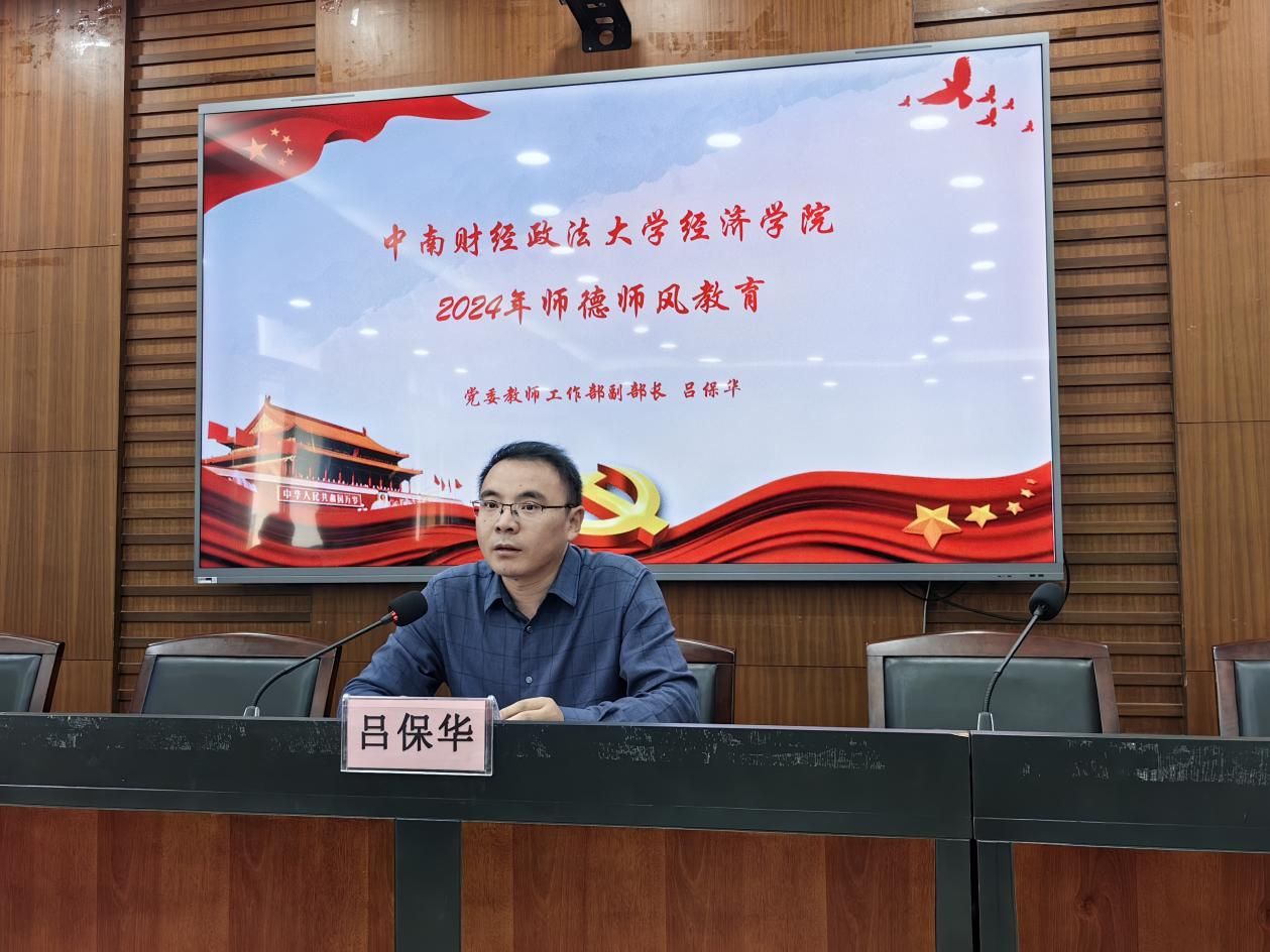 经济学院特别邀请了党委教师工作部副部长吕保华为全院教职工开展师德师风专题教育。吕副部长梳理了国家师德师风建设的发展历程、政策要求,介绍了学校师德师风建设的工作体系、样板工程、奖惩制度,着重讲解了学校师德师风的违规问题及特点,并通过警示案例强调了师德师风是教师队伍素质的第一标准,希望各位老师能够提高警惕,践行师德师风第一标准,做新时代有理想信念、有道德情操、有扎实学识、有仁爱之心的“四有”好老师。