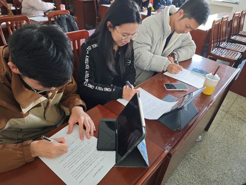 此外,主持人组织党员同志们进行了《考生诚信承诺书》的签署。在庄严的党旗下,全体党员郑重签署了承诺书,承诺在考试中严格遵守考试纪律,自觉维护考试的公平性和公正性,以诚信的态度和扎实的学识展现党员的风采。这一环节不仅增强了党员的责任感和使命感,也进一步强化了党员的诚信意识。