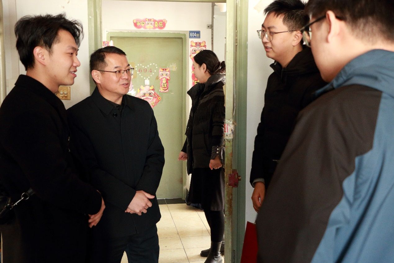 (学生记者 刘路洋 摄影 刘路洋)“书卷多情似故人,晨昏忧乐每相亲。”在这个呵气成霜的冬日,考研的战鼓即将敲响。为了给考研学子们加油鼓劲,经济学院精心筹备了一场暖心关怀活动,为他们送去温暖与力量,用实际行动为他们的逐梦之旅保驾护航。12月18日,经济学院院长石智雷、副院长宋丽智及学生工作办公室的老师们走访2021级学生宿舍,将学院精心准备的备考礼包送到同学们手中。