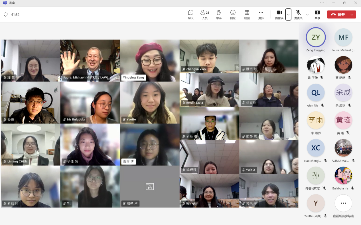 我院近期举办了两场聚焦人工智能和气候变化的讲座。讲座以国际商务专业学生为主要对象,邀请了两位来自欧洲的知名学者、我校文澜讲座教授Fabrizio D' Ascenzo教授和Michael G. Faure院士为师生们带来了两场英文讲座。讲座由中南财经政法大学气候法经济学中心主任、经济学院副教授曾盈盈主持,学院副院长宋丽智教授和外事秘书吴森森老师参加了首场讲座。