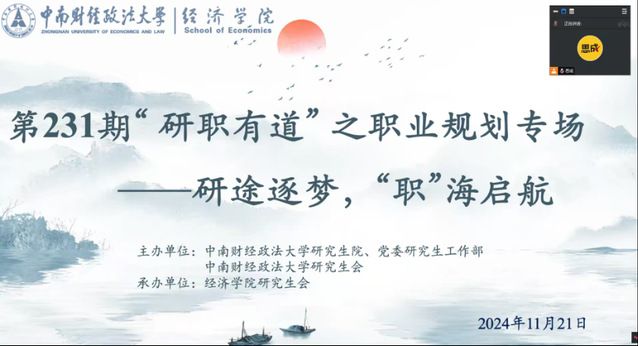 (学生通讯员 刘叶)为了丰富广大研究生的求职经验,帮助同学们更好地制定与职业目标相适应的个人发展计划,11月21日晚,由研究生院、党委研究生工作部、校研究生会主办,经济学院研究生会承办的第231期“研职有道”之职业规划专场活动成功举办。本次活动邀请了思成求职创始人兼CEO孔翔老师和中南财经政法大学经济类专业的Cecilia师姐进行求职经验分享。本次分享会由张芳主持,130余名研究生参与此次活动。
