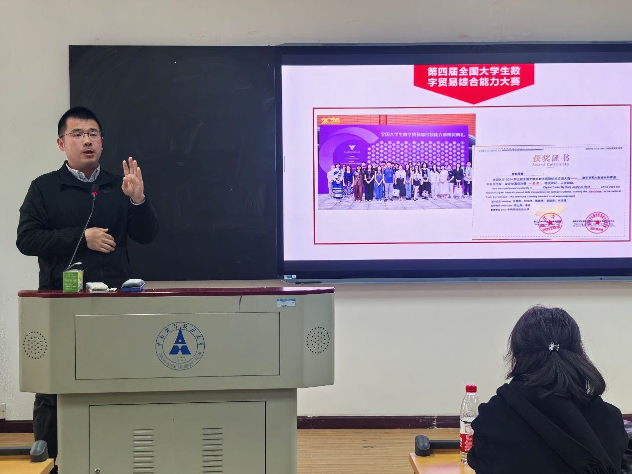 最后,潘安老师重点介绍了国际商务本科专业培养未来改革思路,包括提出要进一步加强国际化建设、案例教学建设、学科竞赛建设等多个方面的改革举措。值得一提的是,潘安老师还向学生们宣传和讲解了2025年第四届全国大学生数字贸易综合能力大赛的相关情况,对学院在2024年第三届全国大学生数字贸易综合能力大赛上取得的优异成绩进行了介绍,积极鼓励学生结合自身兴趣选择适合自身发展特长的赛道参加比赛。