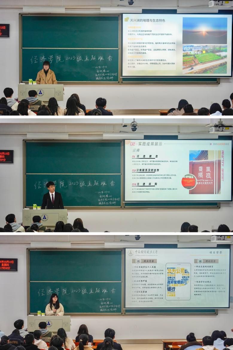 在“实践励志”主题分享环节,经济学院2023级三位本科生同学上台分享了自己寒假社会实践的经历和感悟。徐磐睿同学以“行走中国,解码乡土”为主题,从实践概括、成果展示、瞬间纪实、心得体悟四维度分享实践经历,他坦言:“社会实践如同解码中国的密钥,我们既要带着学术显微镜观察,更需怀揣人文温度倾听。”张逸飞同学则以参与乡村振兴调研的经历为例,呼吁“青年应扎根基层,用专业知识解决社会问题,以实际行动诠释青春担当”。罗淑涵同学介绍了所在团队与11位不同领域校友的深度访谈成果,团队通过对话科技研发、基层治理、文化传播等领域的青年先锋,系统梳理了新时代职业选择的内驱机制与挑战,为大学生职业规划提供了兼具家国情怀与实践价值的可行性建议。三位同学的精彩分享赢得了现场同学们的阵阵掌声,也激发了大家参与社会实践的热情和动力。