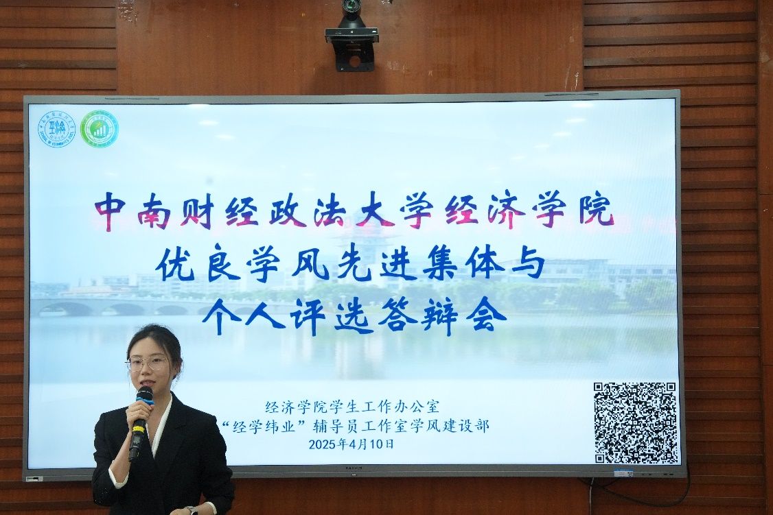 (学生通讯员 黄梓涵 摄影 罗淑涵)为树立学风先进典型,营造积极向上的学习氛围,2025年4月10日下午,经济学院“经学纬业”辅导员工作室在文泉楼南206会议室举办第二届“博文明理肯勤学,砥砺奋发向未来”优良学风先进集体和个人评选答辩会。经济学院学生工作办公室主任周琼、2024级本科生辅导员孟庆红和2023级本科生辅导员包伦娜担任答辩评委。经济学院各年级学生代表到场观看。
