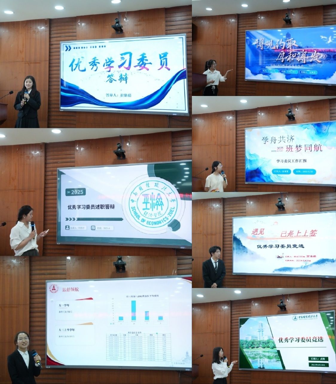 最后,在“优秀学习委员”答辩环节,各学习委员通过述职报告展现了新时代学生干部的责任担当。经法2301班崔铭倩以“积极乐观的实干派”的自我定位,系统展示其在专业学习、学术竞赛、文体活动等领域的综合发展,对待日常工作,她以信心筑牢根基,以恒心推动落实,以真心凝聚共识;数经2201班刘思婷通过精准的角色定位与清晰的工作规划,结合个人优异成绩与班级建设成果,展现其学生干部的示范引领作用;经实2301班刘明月则针对班级现状提出“反思-优化-创新”工作闭环,在系统梳理履职成效的基础上,重点介绍了学风建设提质增效的创新举措与发展目标;经统2301班寇博蕊突出团队协作优势,通过构建班委协同机制,建立学业帮扶体系,切实解决班级学习痛点;国商2203班彭紫萱对自身情况和班级学风建设展开描述,并针对当前存在的问题提出具体改进方案;经济2302班高海祺以幽默风趣的语言对日常工作情况进行了介绍,此外还运用数据可视化手段,通过图表直观呈现班级学风建设成果;数经2301班武悦则以详实的工作经历为基础,通过系统化总结为未来发展锚定方向。