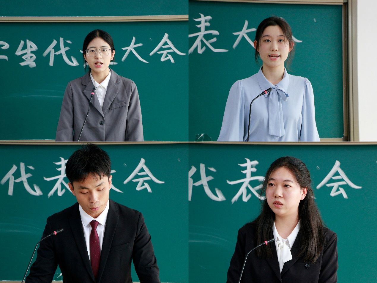 在学代会选举总监票人、监票人、计票人名单的表决程序结束后,主席团候选人依次登台进行竞职演说,他们热情饱满,以清晰的工作规划展现个人能力与服务决心。随后在主持人的有序组织下,全体学生代表投下选票,选举产生中南财经政法大学经济学院出席校学生代表大会常任代表、学生代表,以及中南财经政法大学经济学院第二十六届学生会主席团。