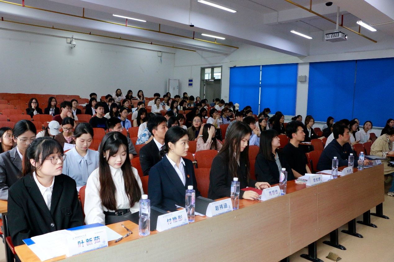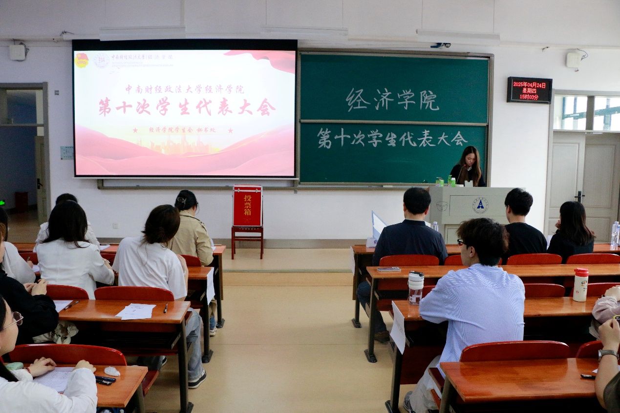 (学生记者 高舒翔 摄影 刘路洋)青衿志在星辰海,晓南湖畔写担当。为深入贯彻习近平新时代中国特色社会主义思想,总结工作经验,提高学生工作质量,顺利完成学生会主席团换届工作,2025年4月24日15点整,中南财经政法大学经济学院第十次学生代表大会(以下简称“学代会”)于南湖校区南附楼204教室顺利召开。经济学院党委副书记俞凡、学生工作办公室主任周琼、团委书记陈远瞻、2024级本科生辅导员孟庆红、2023级本科生辅导员包伦娜、校学生会主席团成员高羽佳及经济学院第二十五届学生会主席团代表出席本次会议。会议分为预备、正式会议两部分,学生会秘书处副秘书长黄乐瑶与学生会主席团成员叶新茹主持,经济学院代表团与会。