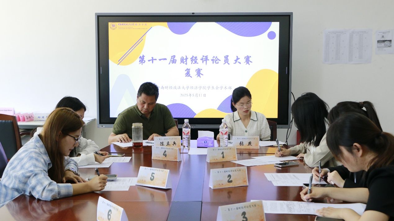 (学生记者 贾一鸣 摄影 蒙楚妍)解析市场逻辑,智启时代新声。为提升学生对财经问题的分析与评论能力,促进学术交流与思维碰撞,第十一届财经评论员大赛复赛于5月11日上午10点在南湖校区文泉楼南207教室举行。大赛由经济学院学生会学术部主办,经济学院党委委员陈立兵、团委副书记张燕担任评委。学术部部长黄悦主持。