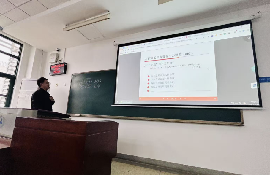 此外,为加强青年教师培养,推动教学传承,张亮老师还指导新入职的张群老师开展教学试讲。在张亮老师的引导与支持下,张群老师以“国际贸易中的引力模型”为主题进行了系统讲解,内容涵盖引力模型的理论基础、关键变量(如GDP、距离、制度环境)及其在解释中国与主要贸易伙伴之间贸易流量方面的应用,并结合中国与RCEP成员国之间的贸易数据,分析了区域一体化对中国贸易发展的积极影响。张群老师的试讲不仅体现了良好的理论素养和教学能力,也展示了新教师积极探索课程思政路径的实践尝试。