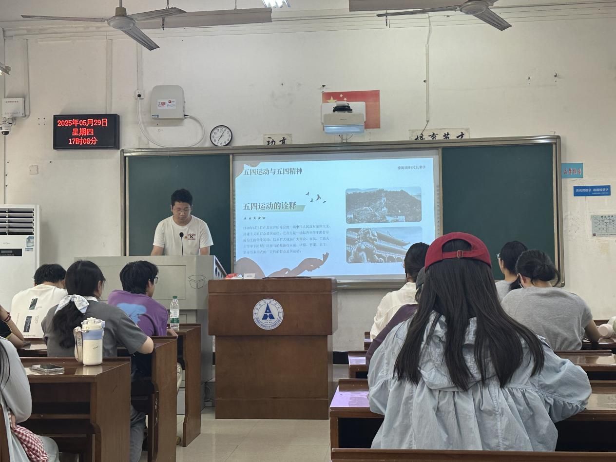 活动伊始,全班同学齐声唱响团歌,同学们的歌声坚定有力,展现出新时代青年积极向上的精神风貌,表达着对共青团的坚定信仰和对美好生活的追求。紧接着,高枫博对五四运动及五四精神进行了详细讲解,回顾了历史背景,并结合人民日报的青年寄语,为同学们深刻诠释了青年一代的历史使命。随后,全班同学观看了主题为“中国青年”的视频,视频生动展现了新时代中国青年的风采和奋斗目标,激发了同学们的集体荣誉感和责任感。高枫博还深入为同学们解读了习近平总书记对青年的亲切回信,回信中明确指出青年要坚定理想信念,勇担时代责任,努力成为有理想、有本领、有担当的时代新人。