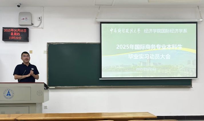 经济学系实习动员大会由系主任谢靖主持。谢靖老师首先向各位同学强调了毕业实习的意义,具体包括促进理论与实践的融合共进,提升综合素质,促进高质量就业以及实现个人价值与社会价值的统一等。
