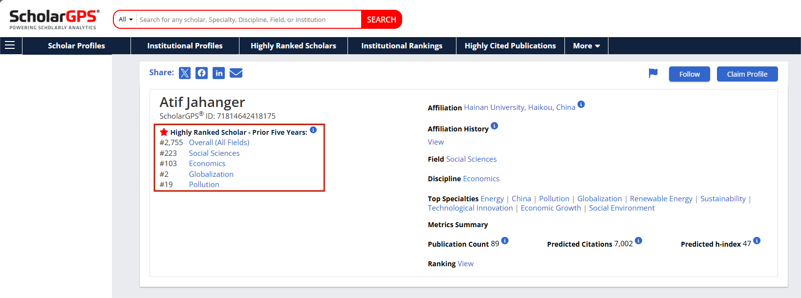近日,国际学术分析平台ScholarGPS发布了2024年度高排名学者全球前0.05%顶尖学者榜单(Highly Ranked Scholars™)。中南财经政法大学经济学院世界经济专业2021届毕业生Atif Jahanger(巴基斯坦籍)(导师:杨波教授)入选此次榜单,并于近五年榜单(Highly Ranked Scholar - Prior Five Years)中位列“全学科领域”前0.02%(Ranked 2,755th in All Fields)、“社会科学领域”前0.02%(Ranked 223rd in Social Sciences Field)及“经济学领域”前0.03%(Ranked 103rd in Economics Field)。