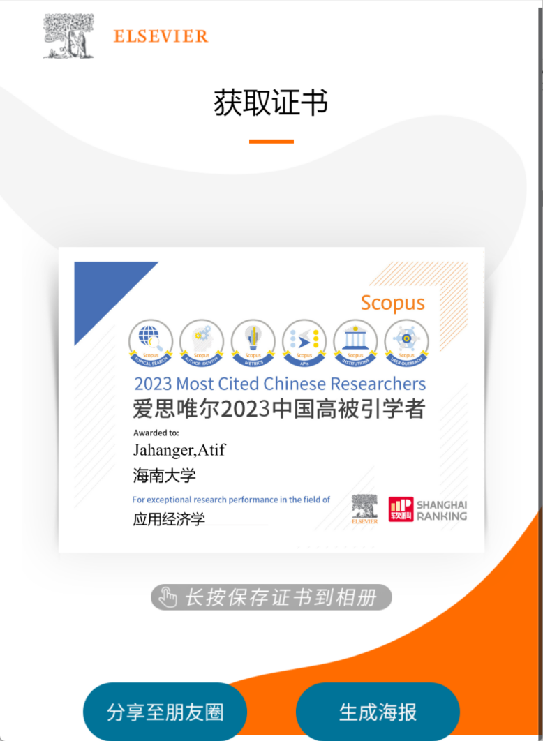 Atif Jahanger近两年连续入选美国斯坦福大学发布的“全球2%顶尖科学家”榜单(World's Top 2% Scientists),其中2023年入选“年度科学影响力排行榜”(single-year impact),2024年入选“终身科学影响力排行榜”(career-long impact)。同时2023 & 2024连续两年入选爱思唯尔(Elsevier)发布的“中国高被引学者” (Highly Cited Chinese Researchers)榜单,成为我校首位蝉联此荣誉的国际学生校友。