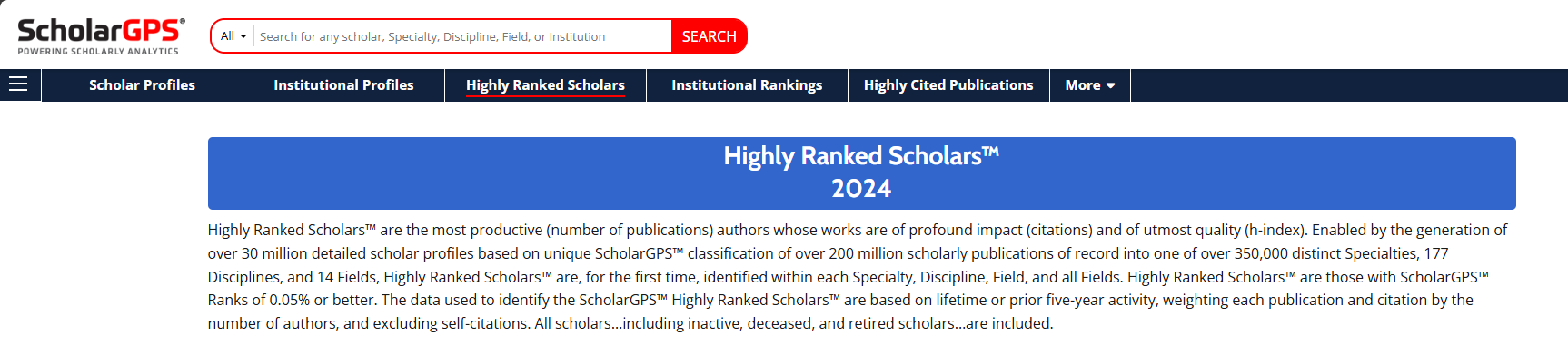ScholarGPS汇集了全球各学科领域3000多万名学者的信息档案以及海量论文、专利、书籍大数据资源。应用人工智能、数据挖掘、机器学习和其他数据科学技术,对学者的研究成果(发表论文数)、影响力(引用次数,已排除自引)和论文质量三项指数进行综合分析,对全球超过3000万学者和55000家机构在各个领域、学科和专业方面(14个领域、177个学科及超过35万个专业)的卓越表现进行排名。